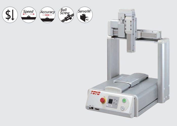 TOYOkaiyun开云电竞桌上型机械手高精度、使用方便、结合专业开发之TOYO FSE软件做点胶机功能,使点胶涂布功能更加丰富。内建CAD转路径功能,可使教导更快,搭配CCD和Laser可以进行XYZ坐标补正,可做到路径的位置连续补偿。可应用于点胶、銲锡、视觉检测、精密对位等场合。